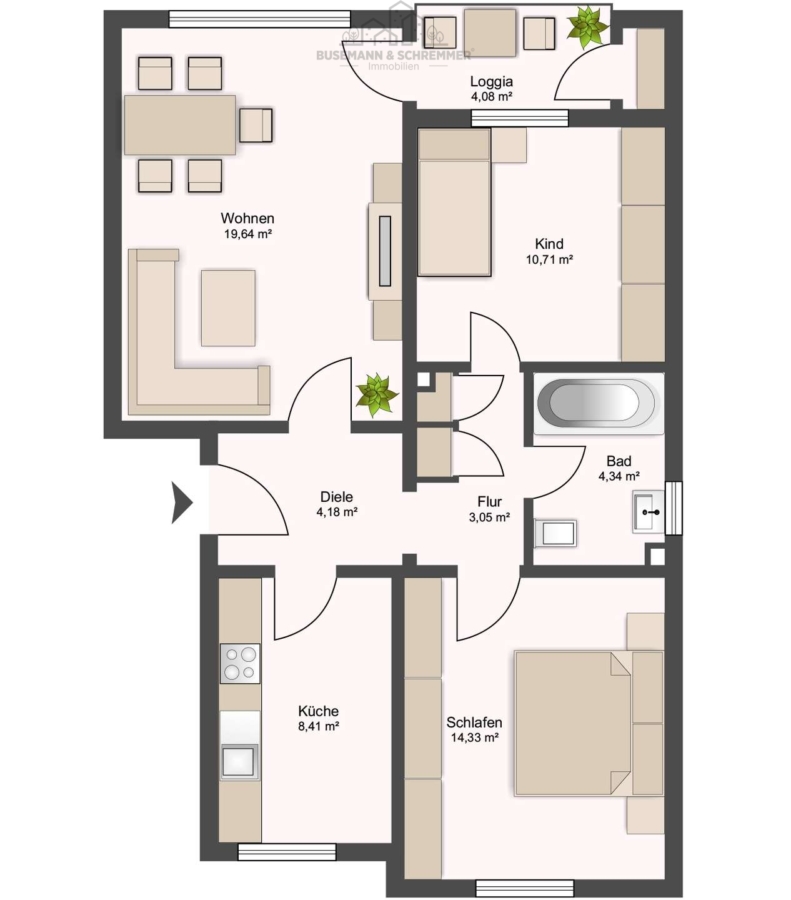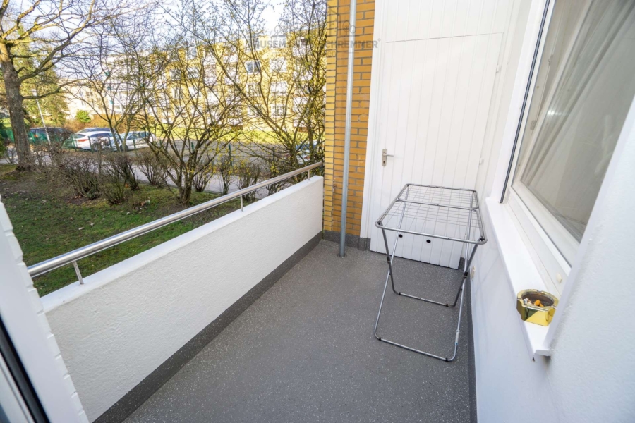Der Wohnbereich bildet den Mittelpunkt der Wohnung und bietet ausreichend Platz für eine Wohnlandschaft sowie einen Essbereich. Von hier aus gelangt man auf die Loggia, die einen geschützten Außenbereich bietet und zusätzlichen Raum zum Entspannen schafft. Direkt angrenzend an die Loggia befindet sich ein außenliegender Abstellraum, der praktische Staufläche für beispielsweise Balkonmöbel oder Haushaltsutensilien bietet.