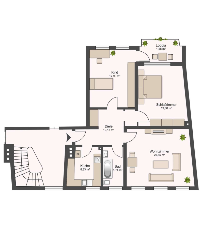 Gut geschnittene 3-Zimmer-Wohnung mit ca. 88 m² Wohnfläche in zentraler Lage. Ideal für Eigennutzer, Kapitalanleger oder Wohngemeinschaften. Zwei Schlafzimmer, großes Wohnzimmer, Tageslichtbad mit Wanne und Waschmaschinenanschluss, Einbauküche, großzügiger Balkon mit Blick ins Grüne. Die Wohnung befindet sich in einem gepflegten Zustand – Malerarbeiten und ein neuer Bodenbelag können je nach Bedarf eingeplant werden. Beheizung über Gasetagenheizung, eigener Kellerraum vorhanden. Denkmalgeschütztes Gebäude, Hausgeld aktuell 252,52 €/Monat.
