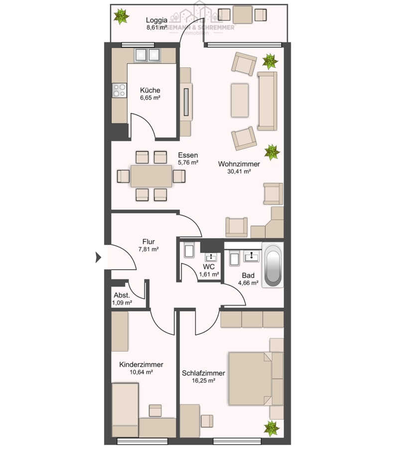 Die Wohnung verfügt über zwei Schlafzimmer, ein Badezimmer sowie ein zusätzliches Gäste-WC. Der Wohnbereich ist großzügig geschnitten und bietet Zugang zum Balkon, der den Wohnraum sinnvoll ergänzt.
