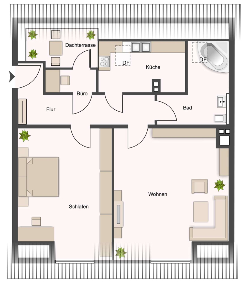 Besonders hervorzuheben ist die nachträglich genehmigte, gemütliche Dachterrasse mit Sonne ab den Nachmittagsstunden. Das kleine Durchgangszimmer eignet sich ideal als Büro oder Homeoffice. Küche und Bad sind mit Veluxfenstern (2004) ausgestattet.