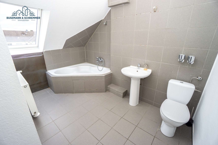 Diese Dachgeschosswohnung bietet ca. 78 m² Wohnfläche (Grundfläche ca. 92 m²) in einem gepflegten Mehrfamilienhaus. Mittelpunkt ist das rund 26 m² große Wohnzimmer mit Erker, der eine bessere Möblierung ermöglicht. Auch das Schlafzimmer verfügt über einen Erker.