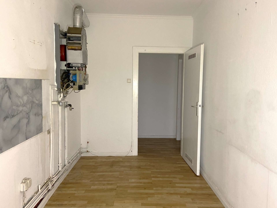 Der zentrale Flur bietet eine praktische Abstellkammer. Von hier aus sind Badezimmer, Küche und Wohnzimmer direkt erreichbar.
