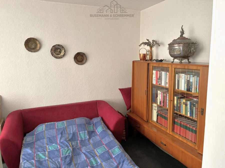 Das Schlafzimmer liegt zur Gartenseite und wirkt durch das große Fenster hell und freundlich. Ideal für einen großen Kleiderschrank und ein gemütliches Bett. Ruhige Lage, perfekt zum Abschalten.