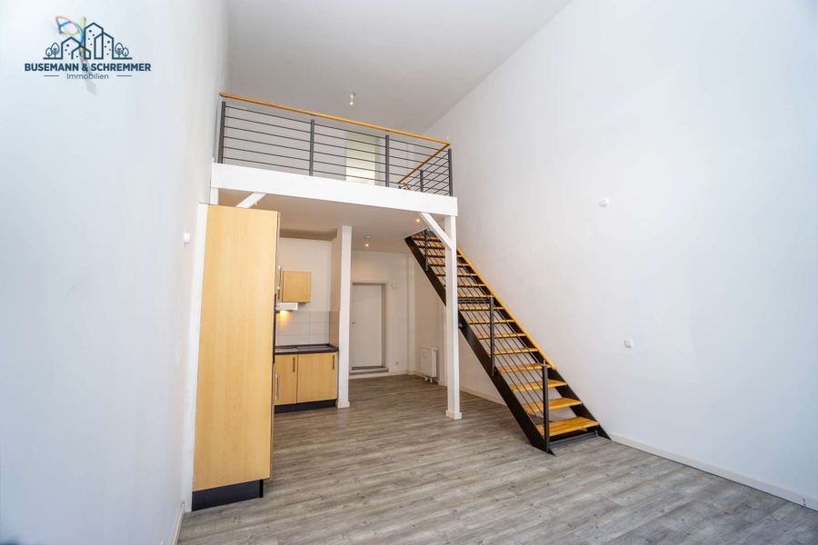 Der zweigeschossige Wohnbereich besticht durch seine offene Gestaltung. Eine integrierte Einbauküche bietet ausreichend Stauraum und ist mit allen notwendigen Geräten ausgestattet. Zusätzlich befindet sich im Erdgeschoss ein modernes Badezimmer mit bodentiefer Dusche.